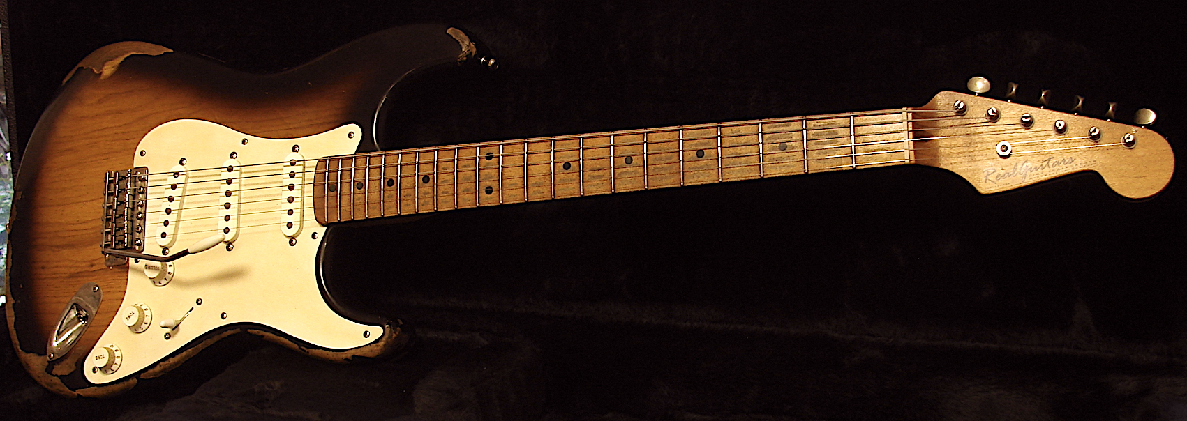 Color:2 Tone Sunburst Look: Very Light Aged Finish: Thin Nitro Finish Body: Swamp Ash Neckshape: Medium C Neckwide: Nut = 43 mm / 12 Fret = 51,8mm 23 Neck thickness: 1 Fret = 22 mm / 12 Fret = 24,3 mm Neckwood: Maple Fingerboard: East Indian Rosewood Radius: 12 Zoll Frets: 22 Jumbo Frets Tremolo: Schaller Lockmeister Floyd Tuner: Kluson Locking Tuner Pots & Switch: 1 x CTS 500/250 Kohm Double Pot , 2 x CTS 250 Kohm TVT Taper Pots, CRT 5 Way Switch,Single Coil Switch over Second Tone Pot Switchcraft Output Jack Electronic: Passiv Real Guitars Volume Controller, No loss of Treble and Bass over the complete Range, Single Coil Switch over Second Tone Pot Tone: Mustard Capacitor Pickguard: Greenish Pickups: 1 x Amber 60s overwound PAF & 2 x Hot 54 Amber Pickups ! Custom Wound Set für Real Guitars ! Weight: 3,66 KG Sold ! |