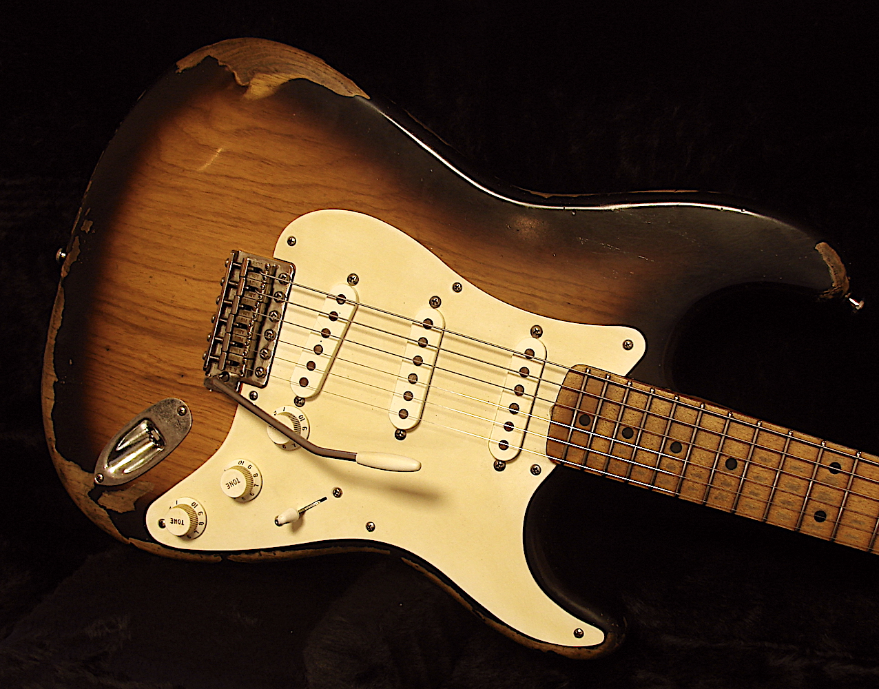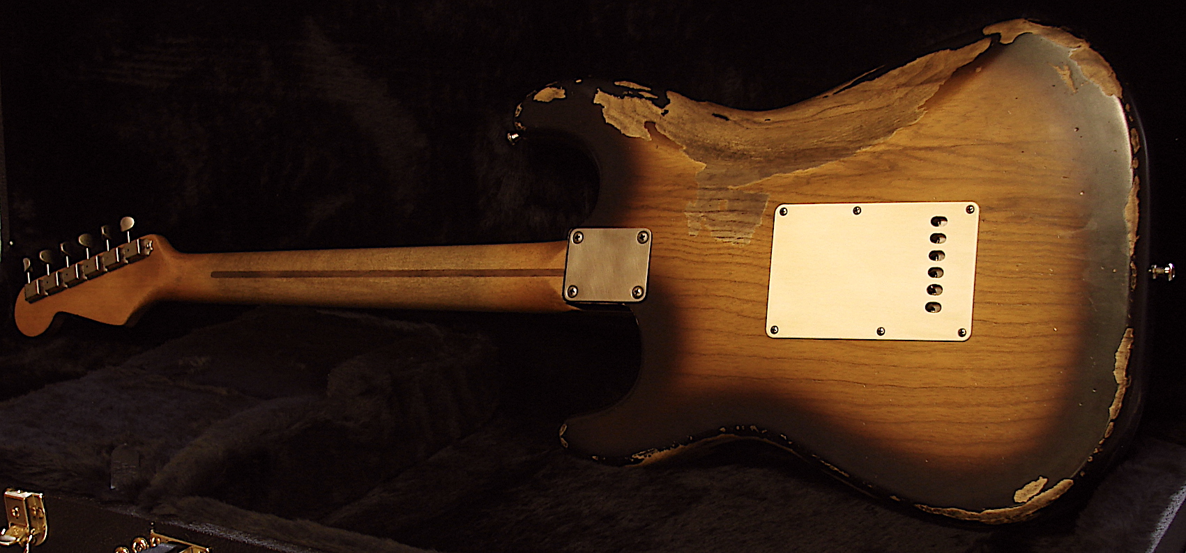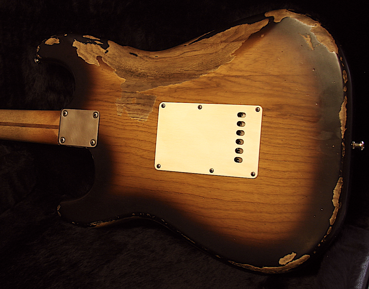 Look: Aged Finish: Ultra Thin Nitro Bodywood: Red Alder Neckshape: Fat Light V Custom Shape Neckwide: Nut = 42,6 mm / 12 Fret = 52,5mm Neck thickness: 1 Fret = 24,5 mm / 12 Fret = 25 mm Neckwood: Killer Birdseye Maple Cab Neck Frets: 22 Sintoms EH Medium Jumbo Frets Radius: 9,5 - 12 Zoll Compound Tremolo: Fender USA Vintage Tremolo with Steelblock & saddles Tuner: Aged Kluson Style Electronic: CTS 250 TVT Taper, CRT 5 Way Switch, Switchcraft Output Jack Tone: Mustard Capacitor Pickguard: Tortoise Pickups: 62 Amber Pickups ! Custom Wound Set for Real Guitars Weight: 3,55 KG Aktueller Baseprice: 2795,- EUR Reversed Headstock & Custom Hand Shape: + 200,- Birdseye Maple Neck: + 150,- In Stock ! Second Hand ! |