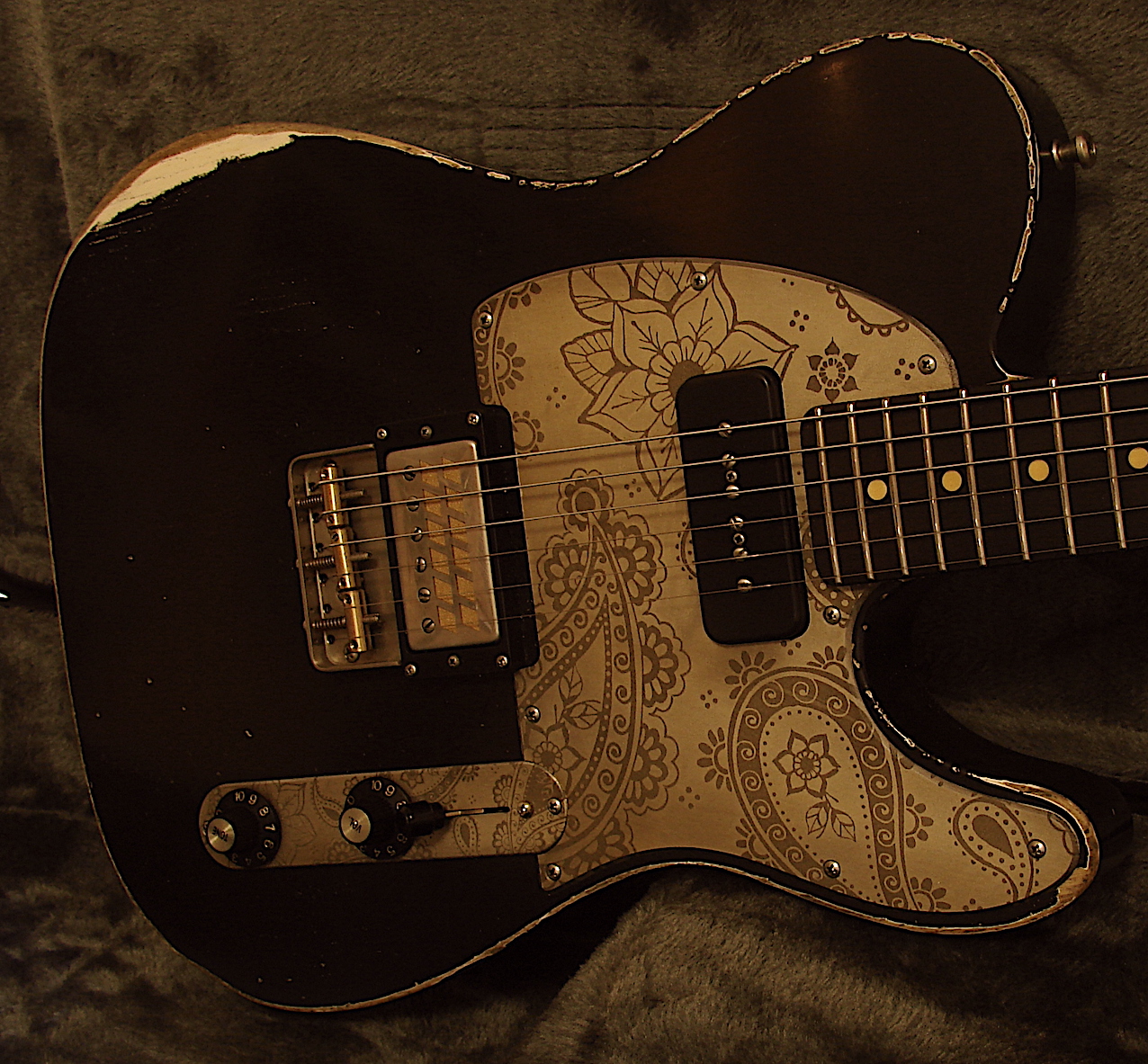 Real Guitars Custom Build T Look: Aged Finish: Ultra Thin Nitro Finish Body: USA Swamp Ash Neckshape: Medium, C Shape Neckwide: Nut = 42,7 mm / 12 Fret = 51,6mm Neck thickness: 1 Fret = 22,5 mm / 12 Fret = 24 mm Neckwood: Killer Flamed Maple Fingerboard: Dark East Indian Rosewood Trussrod: 2 Way - Handmade in Germany for Real Guitars Radius: 9,5 - 12 Zoll Compound Frets: 22 Sintoms 2,8 EH Jumbo Bridge: Short T Style with Brass Bridges Tuner: Gotoh Kluson Style Tuner Pots & Switch: CTS 500 Kohm TVT Taper Pots , Oak 3 Way Switch Electronic: Passiv Real Guitars Volume Controller, No loss of Treble and Bass over the complete Range Tone: Mustard Capacitor Pickguard and Control Plate: Alu engraved Paislay Pickups: Amber 59 PAF Bridge ( Custom wound for Real Guitars ) & P 90 Neck Service: Included 24 Hours artificial transient oscillation ! ( Künstliches Einschwingen ) Weight: 3,44 KG Baseprice: 2695,- EUR Amber 59 PAF + P 90: + 150 EUR Alu engraved Pickguard and Control Plate + 150,- Flamed Maple: + 150,- Swamp Ash: + 100,- In Stock! |