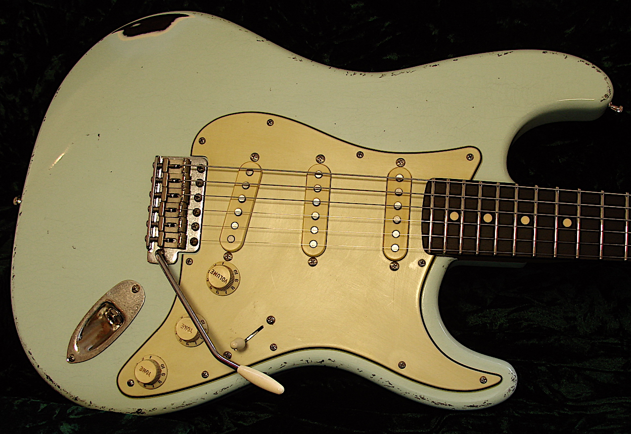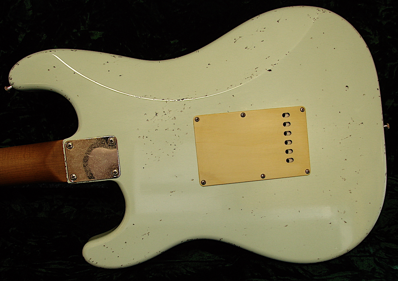 Color: Sea Foam Green Look: Very Light Aged Finish: Nitro Finish Body: Red Alder Neckshape: Medium C Neckwide: Nut = 42 mm / 12 Fret = 51,8mm 23 Neck thickness: 1 Fret = 22,5 mm / 12 Fret = 24 mm Neckwood: Roasted Birdseye Maple Fingerboard: Dark East Indian Rosewood Radius: 9,5 - 12 Zoll Compound Frets: 22 Sintom 2,8 EH Jumbo Frets Tremolo: Aged Gotoh 510 TS - FE1C with Steelblock Tuner: Aged Kluson Locking Pickups: EMG David Gilmour Set with Weight: 3,46 KG Baseprice: 2995,- EUR Roasted Birdseye Maple Neck: +150,- In Stock ! |