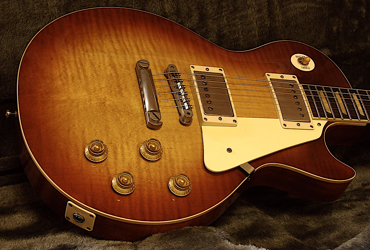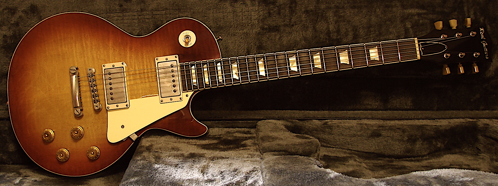 Look: Aged Finish: Ultra Thin Nitro Finish & Nitro Grainfiller Glue: Bone Glue Body: 1 Piece Honduras Mahagoy , Bookmatched Flamed Maple Top ! Neckshape: 59 Medium Fat, Long Tenon, Neckwide: Nut = 43,2 mm / 12 Fret = 53mm / 22 Fret = 57,3 mm Neck thickness: 1 Fret = 22,5 mm / 12 Fret = 24,8 mm Neckwood: 1 Piece Swietenia Genuine ( Honduras) Mahagony from Central America Fingerboard: Madagaskar Palisander - 25 Years Old Stock - Dave Johnson Nitrat Inlays Headstock: 17 degree Headstock Angle, Palisander Headstock Veneer with Real Guitars Inlay Radius: 12 Zoll Radius Frets: Sintoms EH 2,8 Jumbo Bridge: Aged Gibson ABR 1 with Soft Brass Bridges ( Crazy Parts Area 59 VERSION ) Tailpiece: Aged Gibson Alu. Extra long 1,188 zoll Steel Anchors and Steel Studs Tuner: Aged Kluson Tuner Pots & Switch: Matched CTS TVT & BVT ( Central Lab ) Pots , Switchcraft 3 Way Switch, Switchcraft Output Jack Electronic: 50's Wiring Tone: Jupiter Bumble Bee Cabs Pickups: Amber 59 PAFs , Custom wound for Real Guitars,Aged by Real Guitars Nickel Covers. Alnico V, plain enamel wiring.Bridge Output: 8 Kohm,Neck Output: 7,55 Kohm Service: Included 24 Hours artificial transient oscillation ! ( Künstliches Einschwingen ) Weight: 3,67 KG Baseprice: 4995,- EUR Madagaskar Palisander Fingerboard: + 100- EUR 1 piece Honduras Mahagony Body: + 200,- EUR In Stock ! |